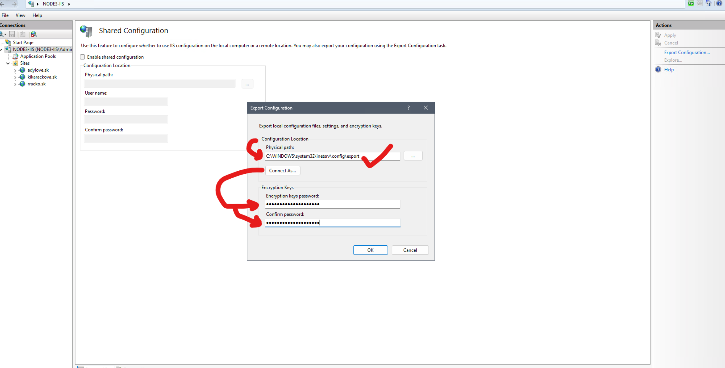 Your existing IIS encryption keys will be backed up in the current configuration directory on your local computer. To restore these keys at a later time, turn off shared configuration.