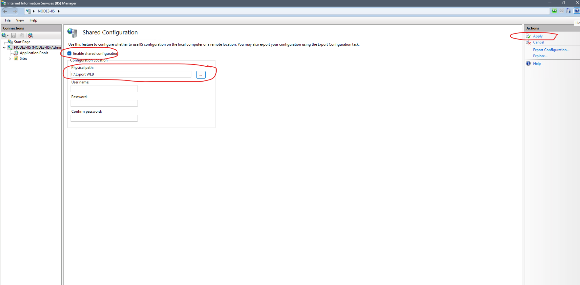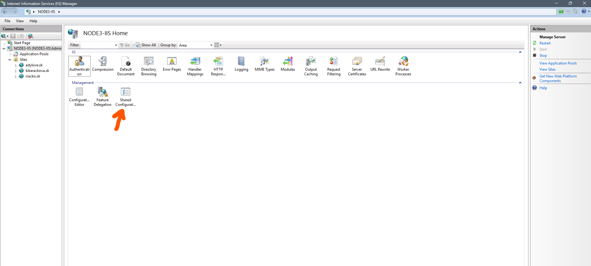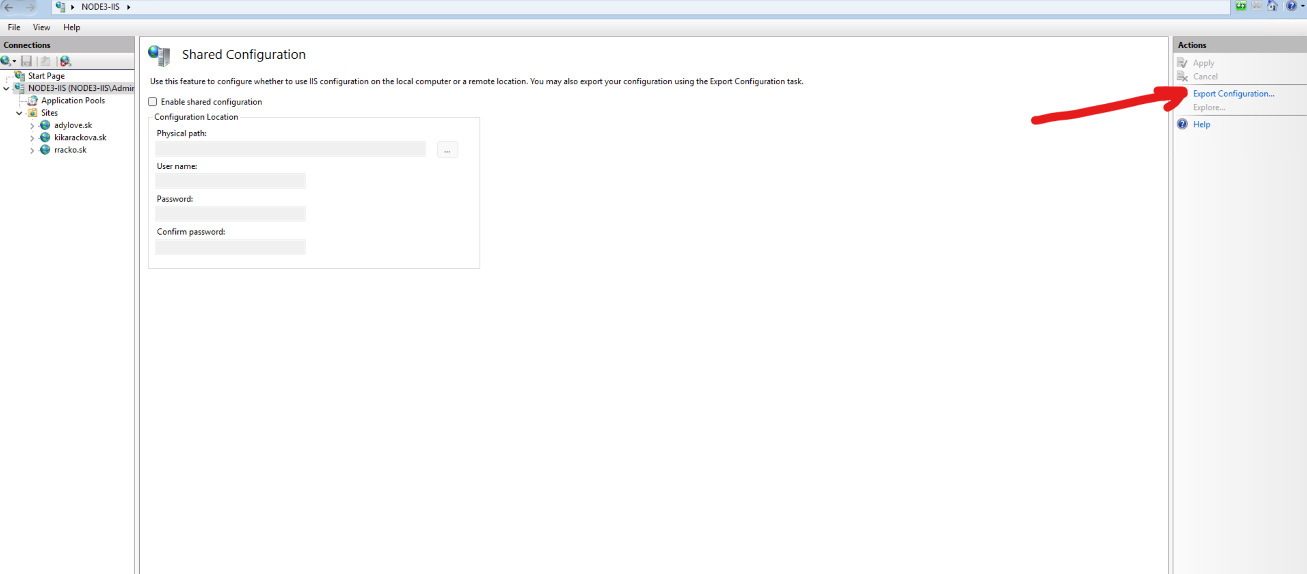 1. Spustite IIS Manager, kliknite na hlavný uzol servera a kliknite na Zdieľaná konfigurácia.