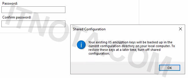 Your existing IIS encryption keys will be backed up in the current configuration directory on your local computer. To restore these keys at a later time, turn off shared configuration.