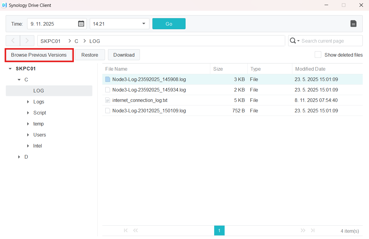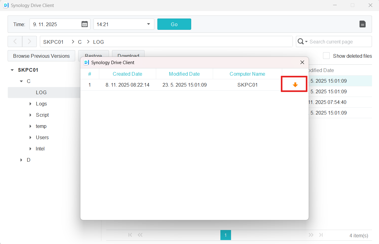 Stiahnutie alebo obnovenie súboru alebo adresára v aplikáci Synology Drive klient