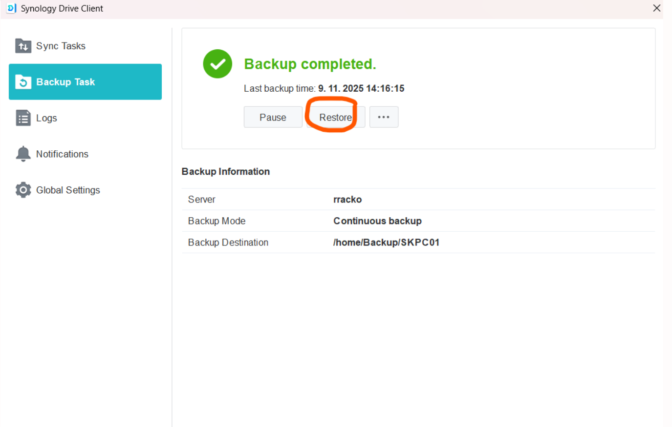 V aplikícii Synology Drive Client prejdite do časti Úloha zálohovania /Backup Task/ Obnovenie /Restore/ a vyhľadajte súbor alebo adresár ktorý chcete obnoviť