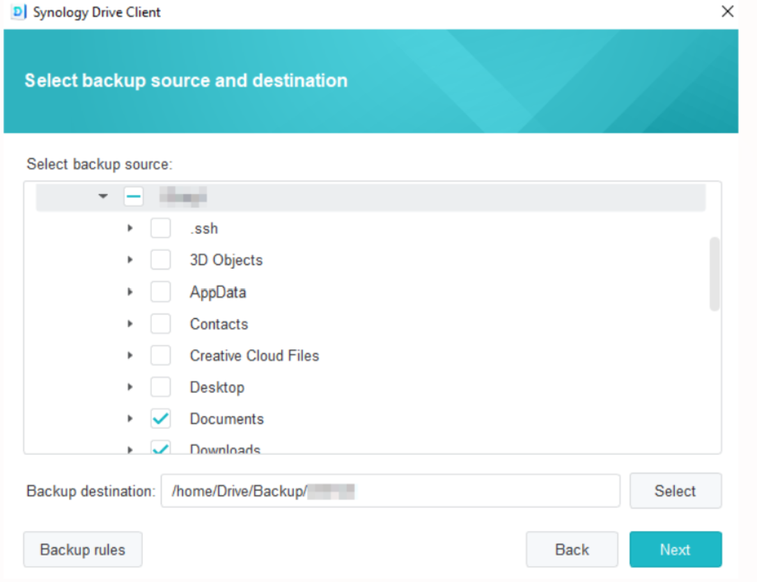 Vyberte zdroj zálohovania a zrušte zaškrtnutie všetkých podzložiek, ktoré synchronizovať nechcete. Služba Synology Drive Client vytvorí na vybranom ciely zálohovánie zálohovaciu zložku s názvom vašeho počítača. Podľa východzieho nastavenia bude ako cieľová zložka vybratá zložka HOME.