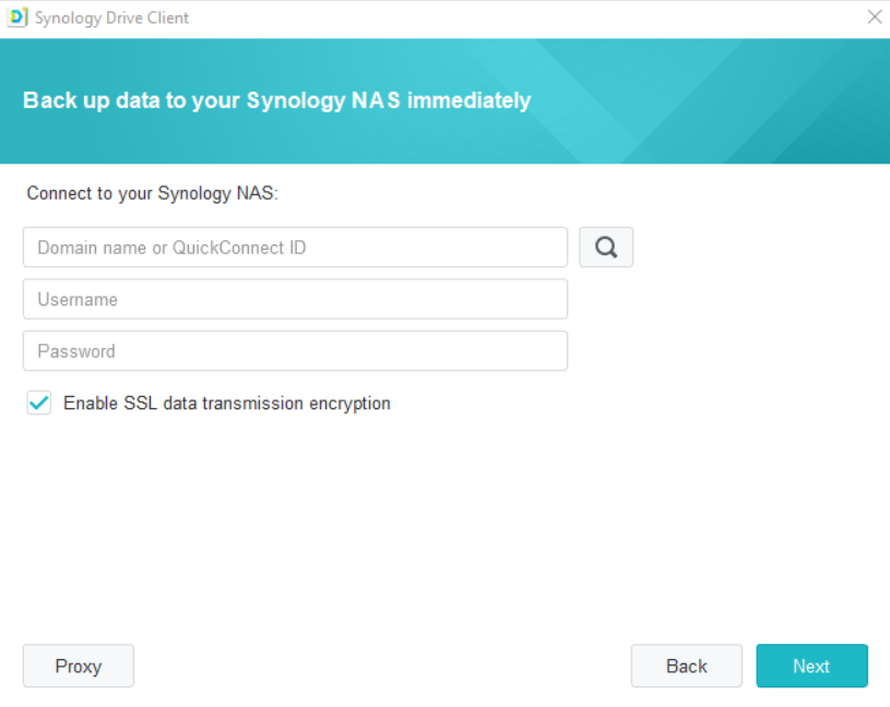 Zadajte adresu alebo quick connect (ak máte vytvorený) servera Synology NAS so spustenou službou Synology Drive Server, potom užívatelské meno a heslo. Môžete tiež kliknúť na ikonu vyhľadávania vpravo a služba Synology Drive Client automaticky vyhľadá všetky zariadenia Synology NAS v rámci miestej sieti.