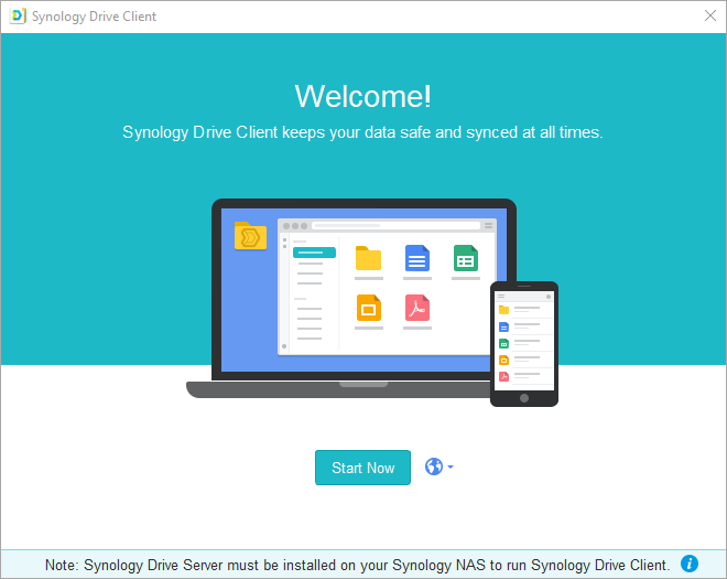 Spustite na počítači inštalačný program a postupujte podľa pokynov na inštaláciu aplikácie Synology Drive Client. Po inštalácii spustite aplikáciu Synology Drive Client kliknutím na položku Začať (Start Now)